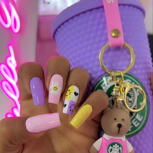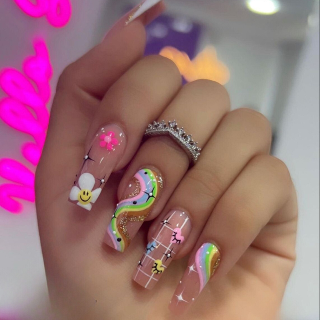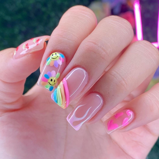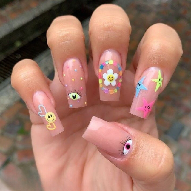A modern interpretation of summer is represented through long, clear nails that have been decorated with candy-colored charms and smiley faces that emit positivity. It is a design that explicitly says that one person is someone who loves to share happiness and good vibes with others.