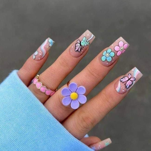 Like a burst of spring in the middle of summer, these nails are enriched with blooming flowers and butterflies, looking gorgeous on the nude base. The square design is the base for the artistic patterns in light blue, pink, and a little bit of glitter. Such a style is a token of love to the clear blue skies and blossoming gardens that are typical in the season, perfect for the laid-back park strolls or outside weddings.