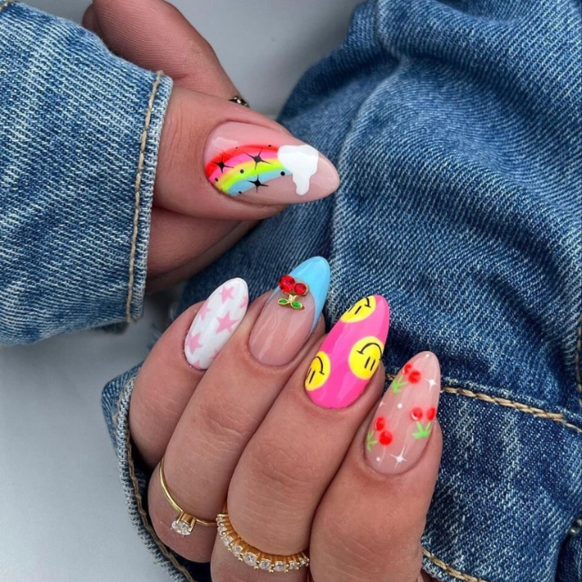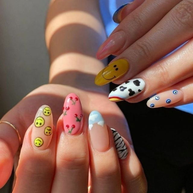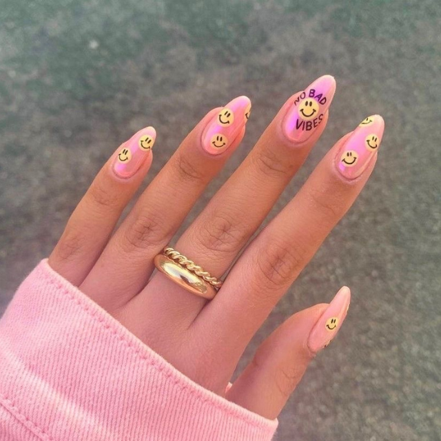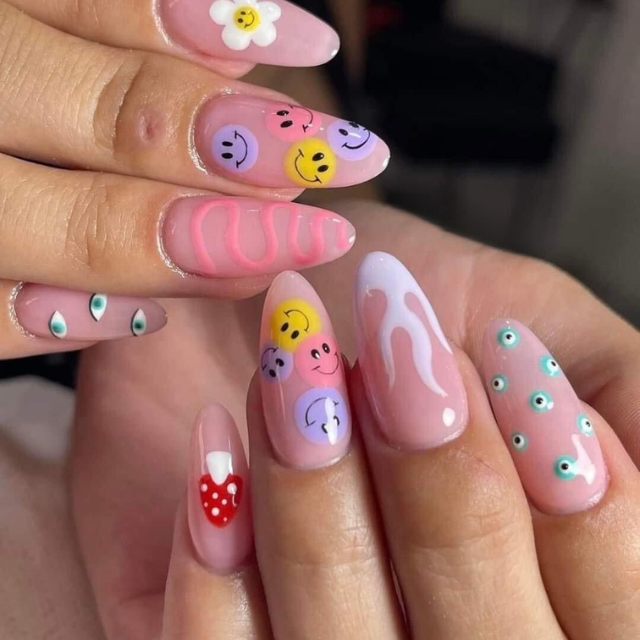 The pastel pink of these tiny and round nails brings back the taste of cupcakes with blueberry icing. They have a 90’s vibe for being decorated with smiley faces and tiny hearts, just like the summers of my childhood. The combination of teal dots not only serves as a trendy detail but also makes the set look simultaneously modern and nostalgic.