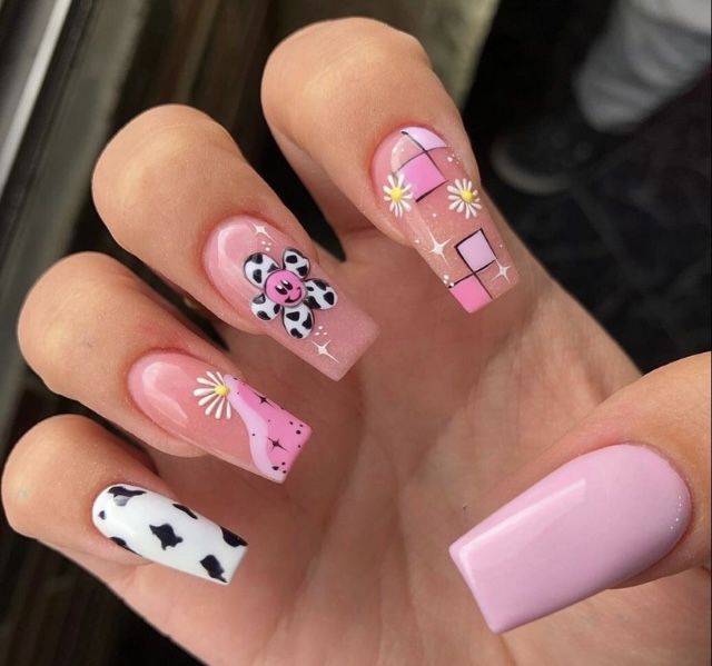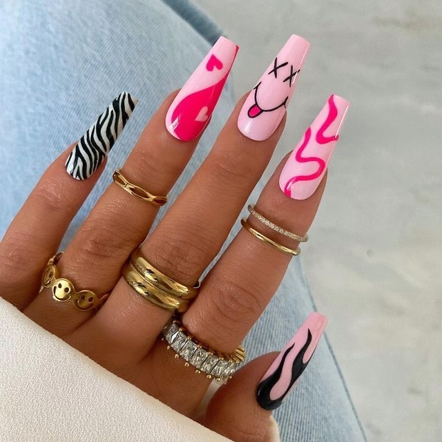 Bringing the long nail trend to the next level, this design is a fresh combination of pink shades and striking patterns. This unique style of checkered and heart-shaped nails, which alternate between each other, is for women who are fashion-forward and are not afraid to express themselves. The coffin shape contributes a contemporary touch, thus it is a great ice breaker at parties or a marvelous addition for night outs.