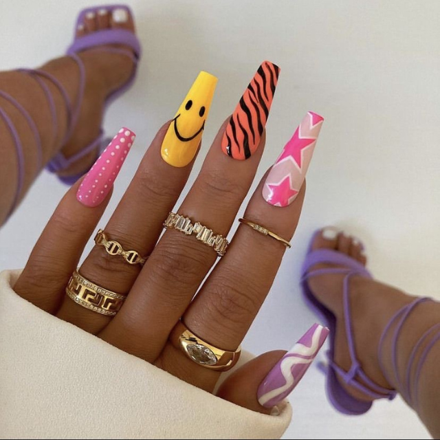This is a typical summer statement design, long nails adorned with different shapes and colors, such as sunny yellow, candy pink, and zebra stripes. It is a representation of the summer season’s spirit of mixing and matching, and the almond shape holds it to a higher level of elegance. These nails are for those who enjoy testing different looks and are hunting for unique ideas to be different from others.