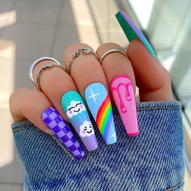 This design comes very near to the heart of summer with its quirky icons of vibrant rainbows and pastel stars that adorn the surface of the short nails,. It’s akin to getting the first look at a standing rainbow following a summer rain—a phenomenon that is unforeseen yet completely captivating.