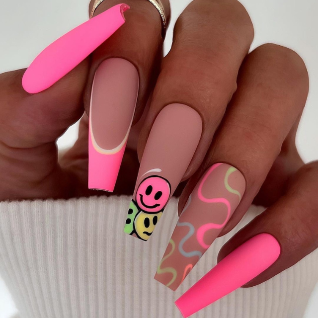We have stylish long nails that join the softness of matte nudes with the electric energy of neon pink. The winking smiley face, along with the abstract swirls, is the reason for the set to be so dynamic and youthful. These nails are ideal for a woman who can enter a business meeting and a fun summer night out equally well.