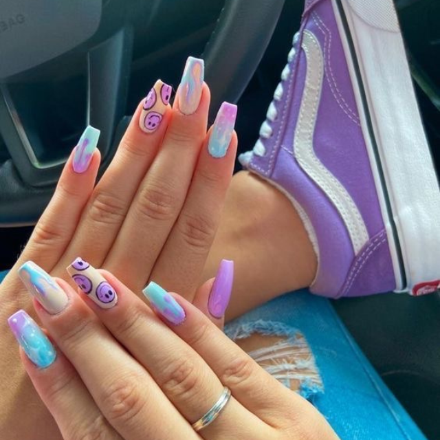 The long and oval-shaped nails have a beautiful combination of pastel purple and blue with swirls and art designs that remind one of the joy of summer. The nails look exactly similar to the colours of a fashionable pair of sneakers, which present a vivid lifestyle and full of sport and taste. It is a design that presents a picture of motion and power and is befitting for a go-getter fashionista.