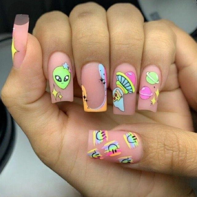 Dreamers who love to aim for the stars are sure to like these minimalistic alien and spaceship designs. They are the perfect matte nails to take you on a fun journey across the galaxy. The pale pink background definitely acts as a canvas for the funky joint of colors, while they are an amazing choice for ladies who want to be different and colorful in their everyday life.