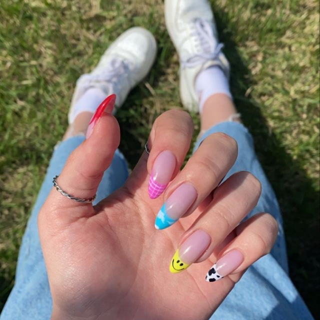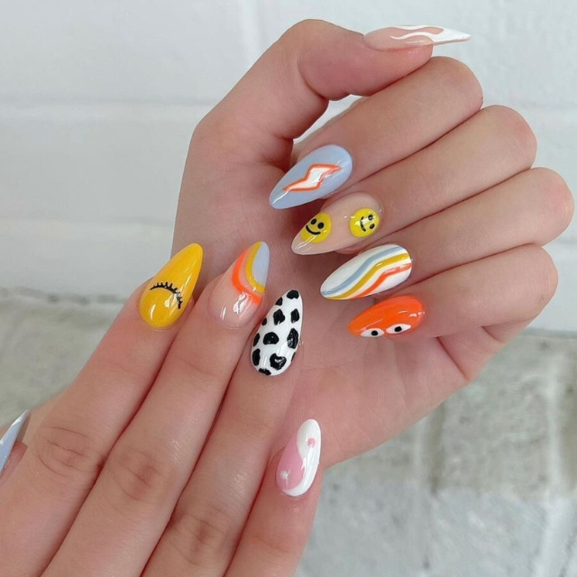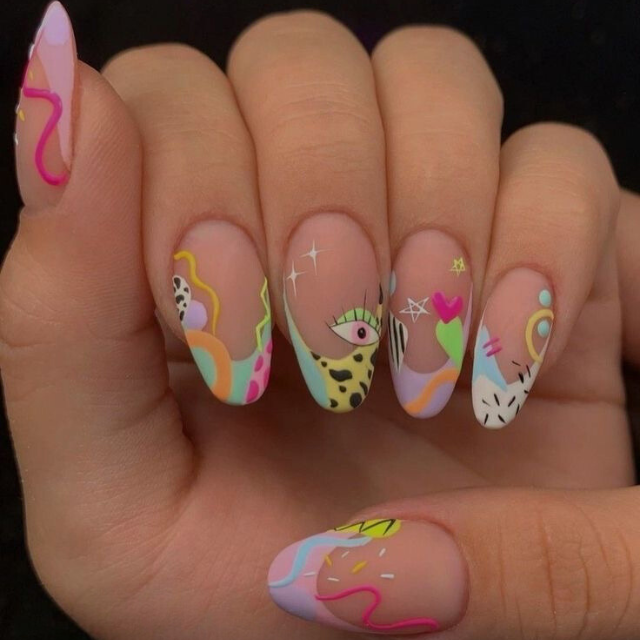 The design is whimsical and goes with the theme of a walk in the park. Without a doubt, the oval nails show the abstract design of the art of some artist. Neon, geometric shapes, and playful patterns are the main decorations of this painting that are deeply in love with shades and brights. It is the ideal for a woman who considers the world to be her canvas and her body to be her paintbrush.