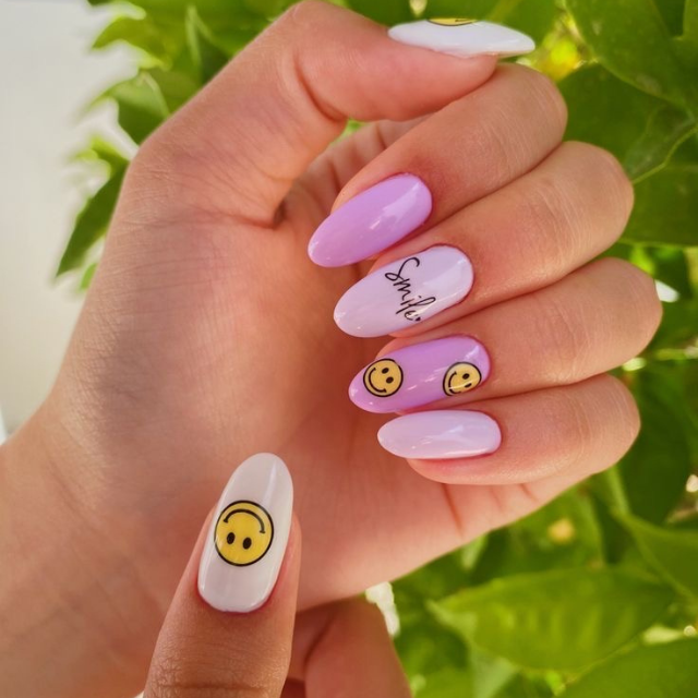 At times, the simplest things are the ones that make the biggest impression. These tiny, seed-shaped nails in a soft lavender color are decorated with adorable smiley faces that give us the message that happiness is so close to us. One handwritten nail that says ”smile” serves as a small motivation to help you see the jocular side of your life.