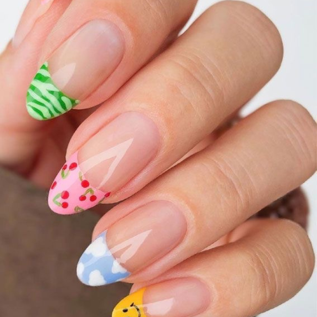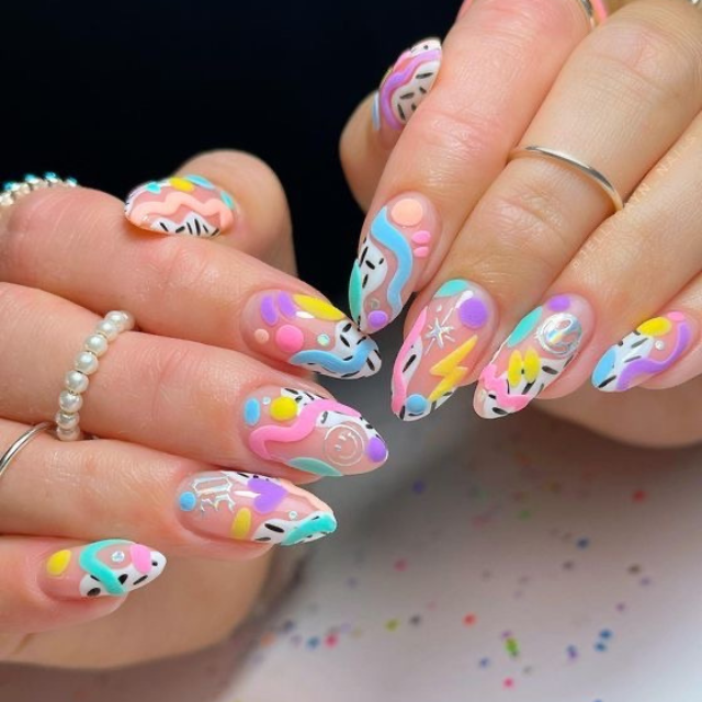 Neon is coming back this summer, which is why it is all about fun nails. Picture a long clear tip canvas covered with bright neon pink and orange which is blended with a design of fun things like abstract faces and flames. The nail shape changes from an oval to an almond contour, it is great to make your look a little bit edgy. These nails are not only for fashion but also for lifting your mood, and they go well at rooftop parties and beach barbecues.