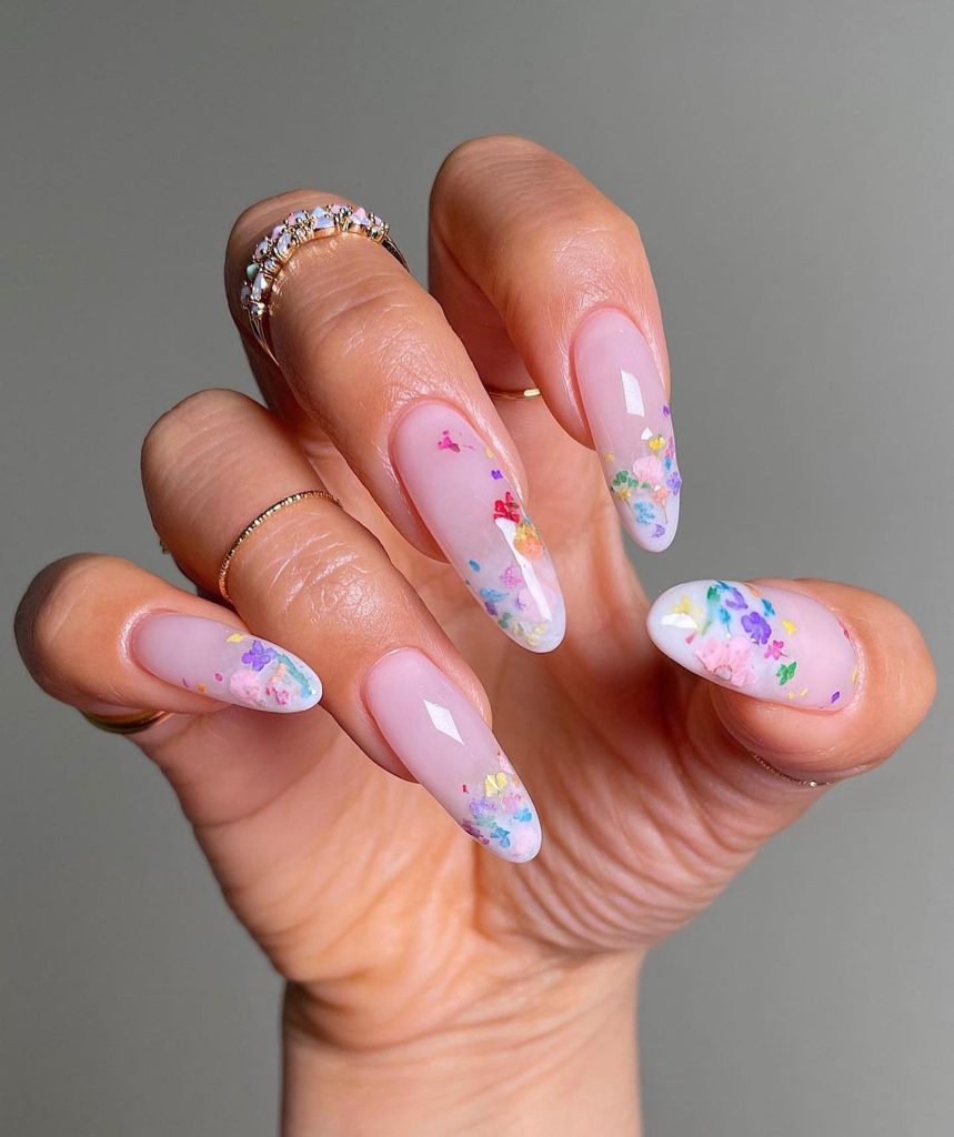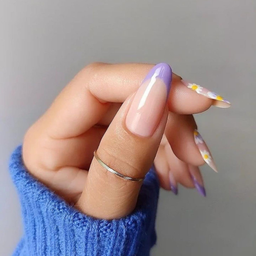Almond nails are being told spring gardens stories, with the floral pattern being one of the most delicate. The background color is sheer, on which small flowers in lavender, a soft pink, and a bright yellow bloom create a design that is both playful and romantic.