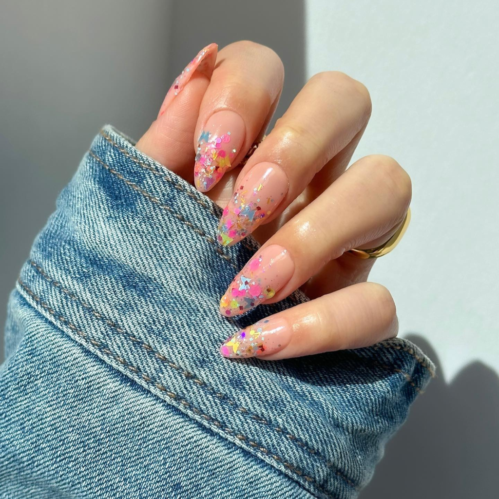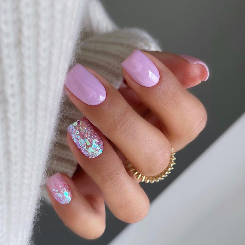 The nails are made for those who want to add a little bit of sparkle. They are a combination of light lilac and pink shades with a touch of glitter which emits a calm yet cheerful atmosphere making them ideal for casual brunches and spring parties.