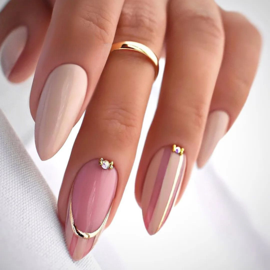 Moderate neutral color inlaid geometry and lines makes them look top-notch. The gold embellishments result in a bit of shine on the matte surface of the nails and thus suggest a sophisticated yet modern version of the classical spring pastels.