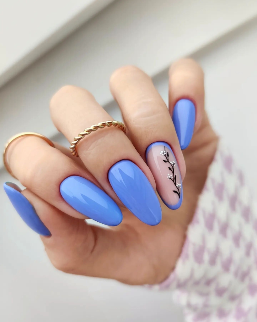 In these nails, the clear-blue spring skies are reflected with a bright blue tone that is both dreamy and earthbound. A subtle black branch layout beautifully introduces the artistic touch, reminiscent of a peaceful Japanese garden.