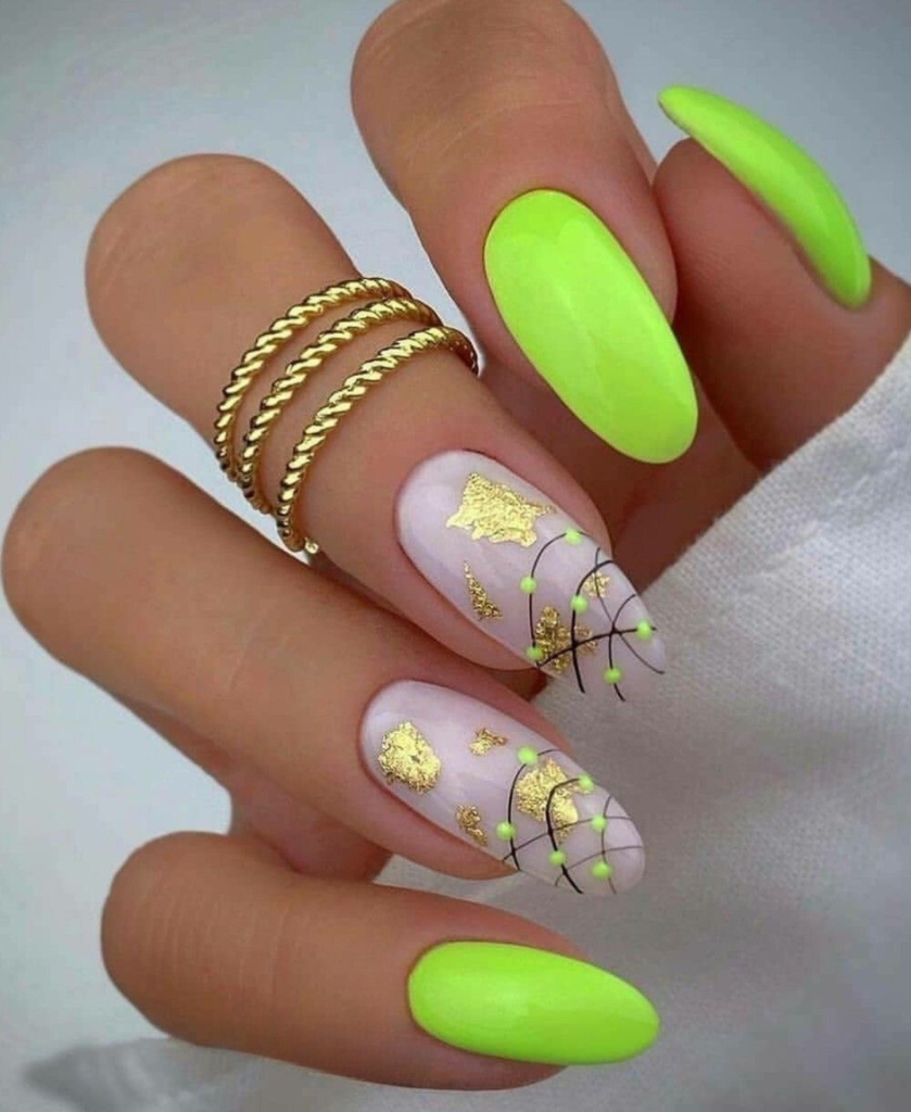 The charm of neon green comes from the neon palette that has been dipped into the center of the neon green is the balance of flamboyance and sophistication. A big part of this art is the almond-shaped acrylic, which adds a feeling of elegance. This matte and shiny finish contrasting are clear evidence of modern women’s duality, who maintain multiple roles with ease. The nude base on some nails is adorned with gold leaf patterns, suggesting a luxury that is both simple and dynamic. This pattern is suitable for those who would like to have short nails but want to make a statement.