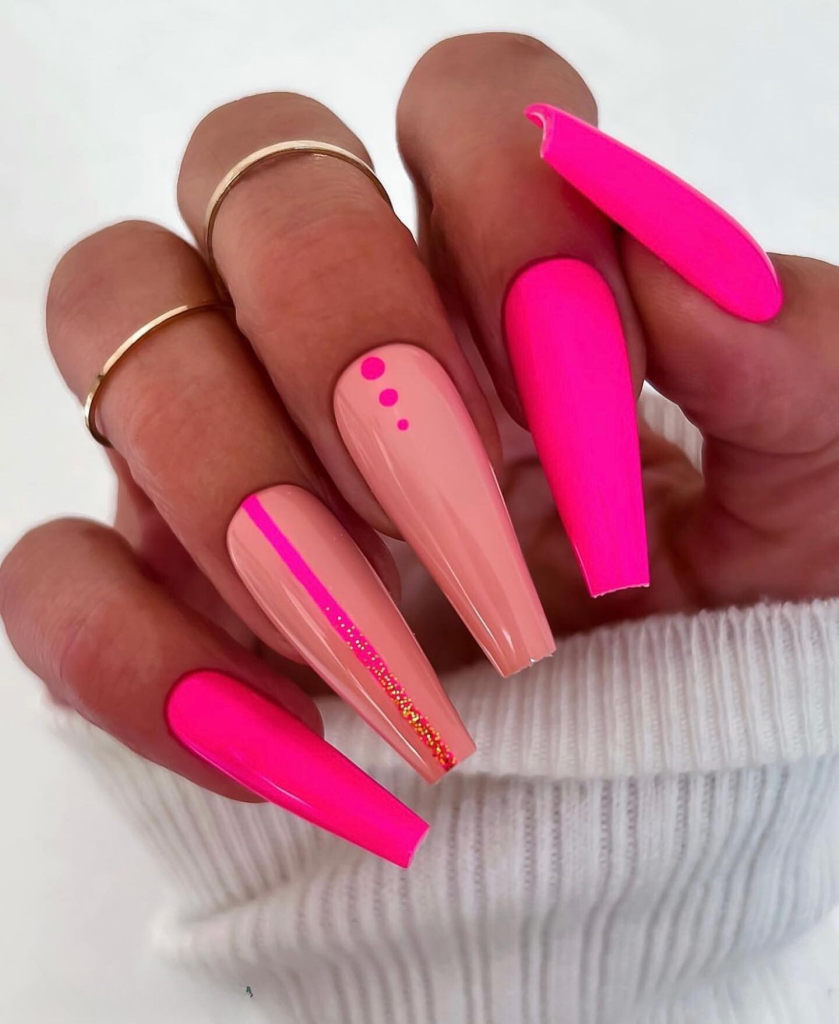 The summer sky’s beautiful clouds that look like a dream have been the inspiration for this spectacular coffin design. The central nails have a gradient effect that is a work of art of neon oranges, yellows, and pinks that resemble the trends of 2024. This set of nails has pink nails that are as bright as the most lively flowers of the season and is an excellent choice for the woman who is the center of attention by her extraordinary stylishness and who celebrates life is fullness with every color.