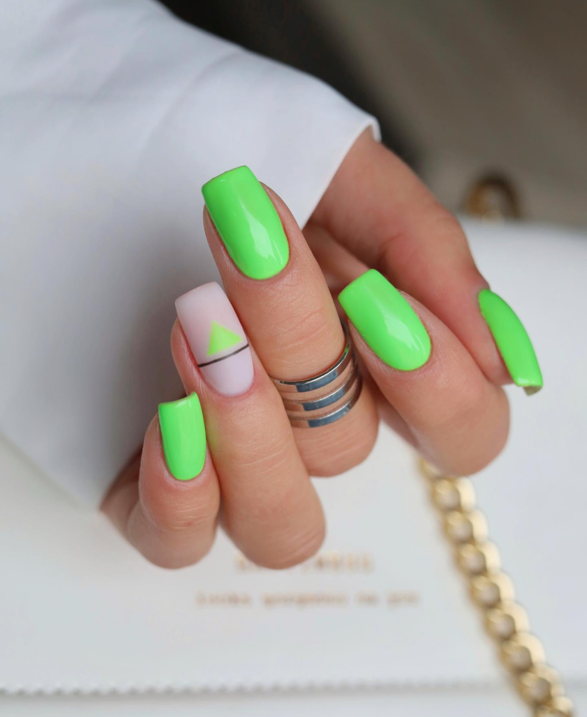 For the minimalist at heart, these neon green tips with geometric precision offer a fresh perspective. The short length is a nod to practicality, while the sharp triangular designs at the nail beds are a celebration of modern art. It’s a style that says less is more, making it an ideal choice for those who love to make a statement with subtlety. Pair these nails with a crisp white shirt or a structured blazer to channel a look that’s at the forefront of the 2024 fashion scene.
