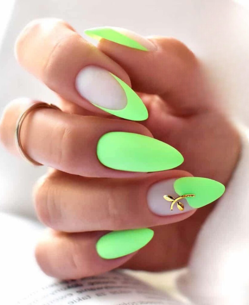 The neon trend this summer goes an artistic way with cut-out designs which are no less than a masterpiece. The almond shape, which is the best choice for its feminine and elongating effect, is used here with the short length for a modern twist. These nails bring a play of alternating shades of neon green and matte white, with a little gold charm which is quite simple but precious making the bright set perfectly opulent. The ‘Sparkly Gold Charm’ is a creative and artistic expression for a lady who finds pleasure in the minutest of details and fancy a hint of glamour in her everyday wear.