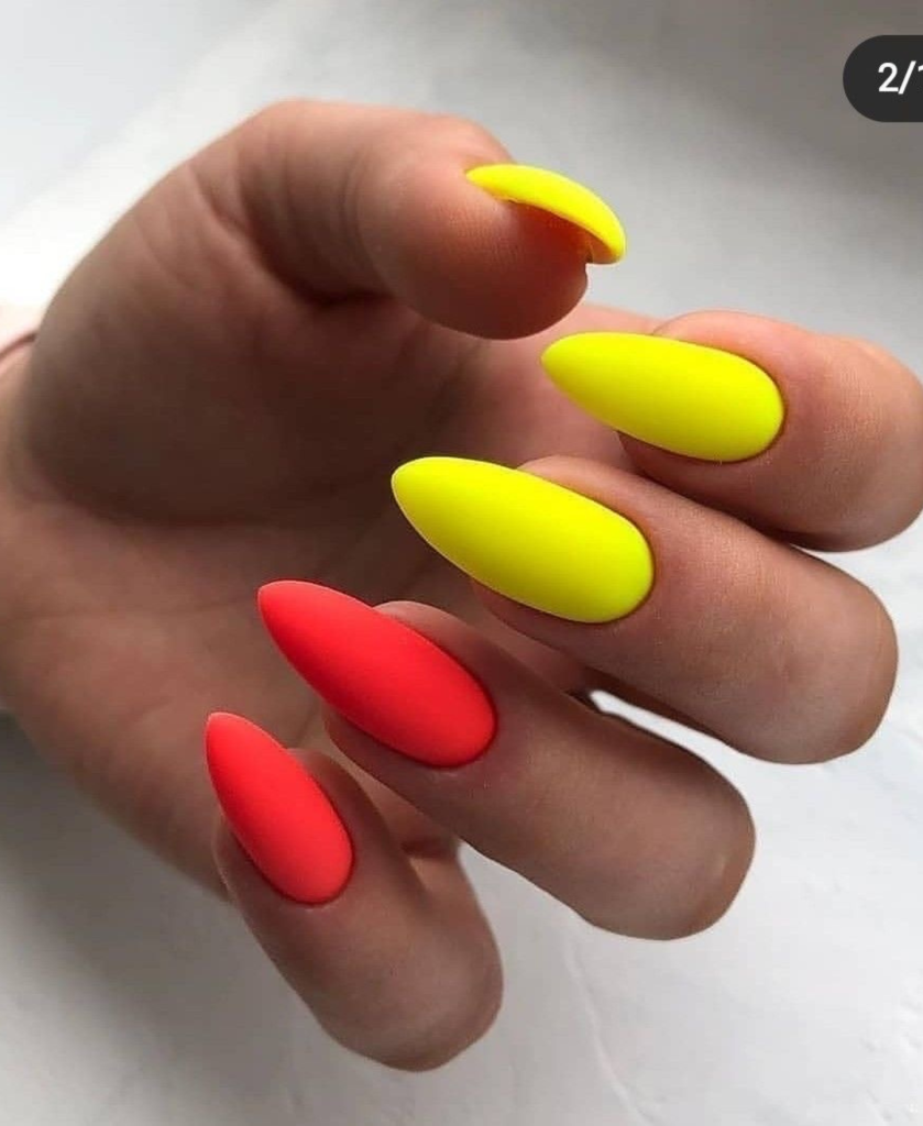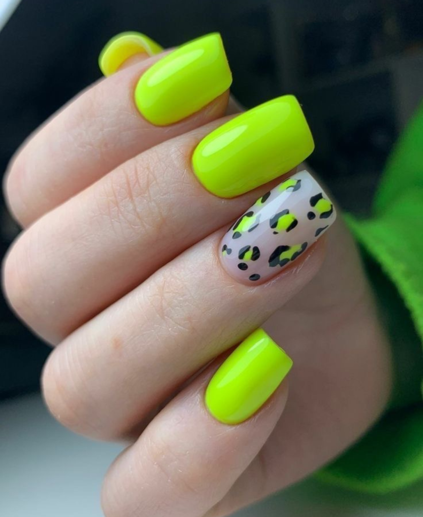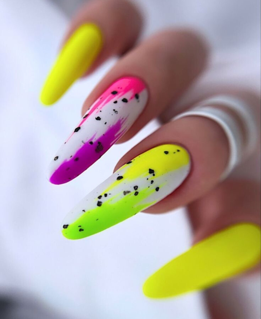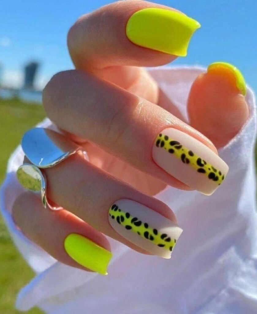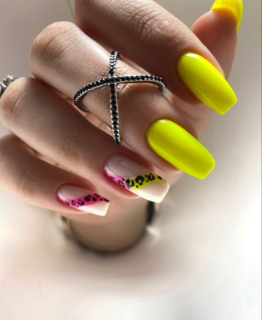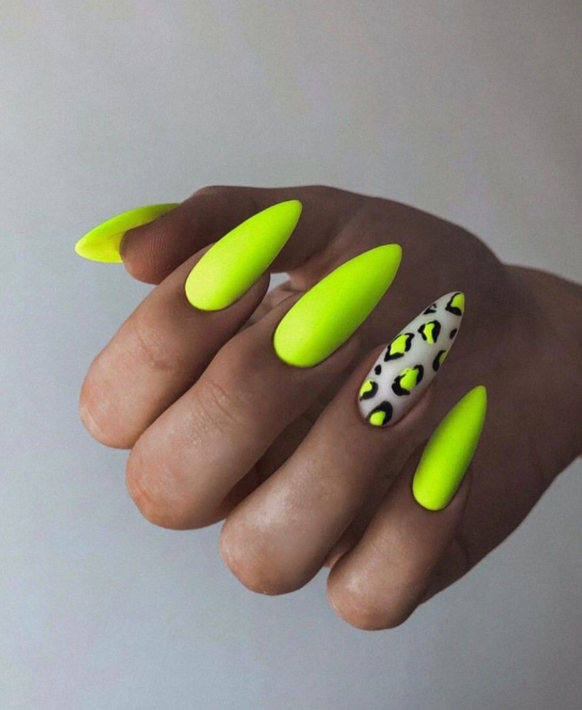 Neon yellow electricity and a playful pop-art twist create a dashing coffin nail pattern that is the epitome of youth. The short stilettos are leopard painted randomly, which is the trendy 2023 shape with a different color, almond neon. It is like a bed of flowers with a woman on each nail whose aura is as sunny and decorated like a master artist’s canvas. These nails are for the woman who is a sport and an artist at heart, her dress is the canvas and she is a true embodiment of cute and artistic flair.