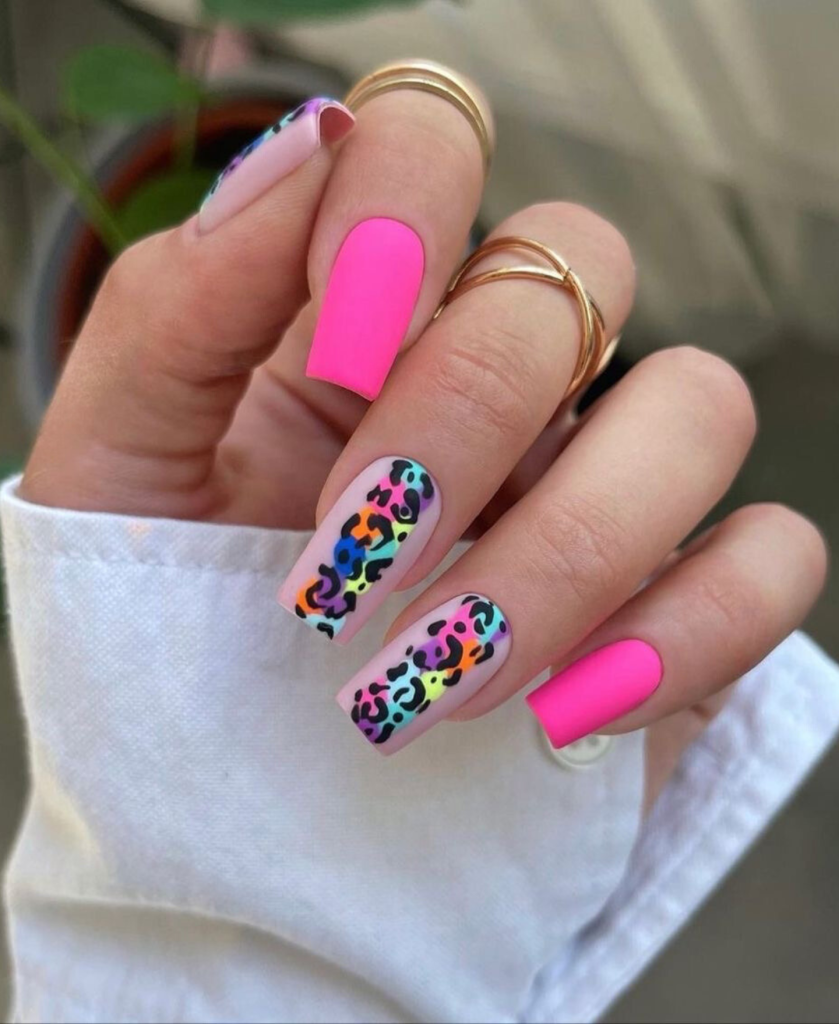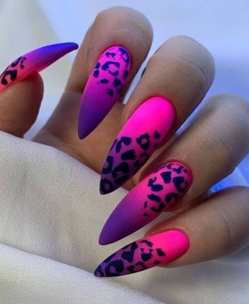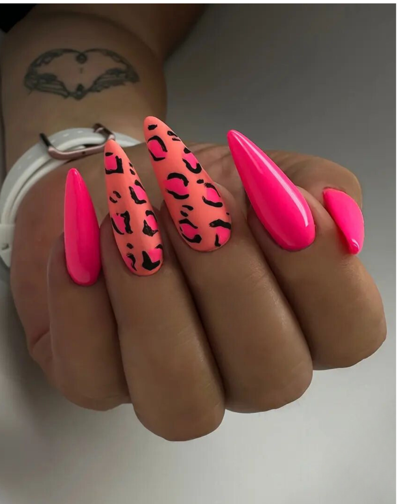 These are the nails you need if you’re a wild and whimsical lover, they offer you a vivid pink to purple gradient decorated with a dashing Leopard skin design. Again the coffin shape makes the cut as it is a 2024 favorite, and generous enough for the art to be the only celebrity. This is a design that is both adorable and bold, it brings the spirit of 2023 almond nails to the fore while challenging the traditional neon fashions.-It is a fantastic selection for a hot summer evening outside or for a daring day in the metropolis.