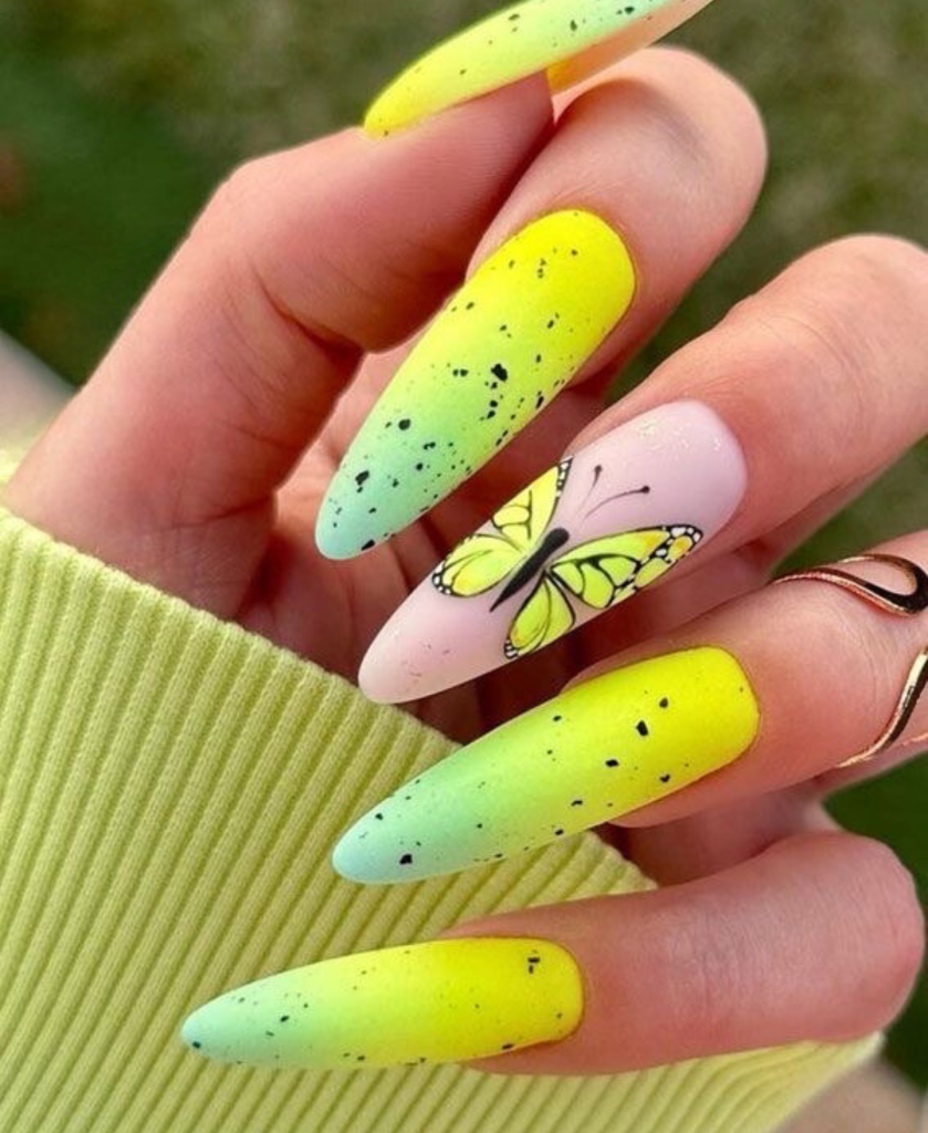 This is a design that perfectly illustrates a summer garden. It features a delicately accentuated butterfly which appears to perch on a vivid neon green ombre nails bed. The coffin shape is an additional detail, which makes the nail design more artistic and more interesting for the free spirit. The short nails are highlighted with black like seeds in the wind, a thought that reminds us that beauty is often very simple.