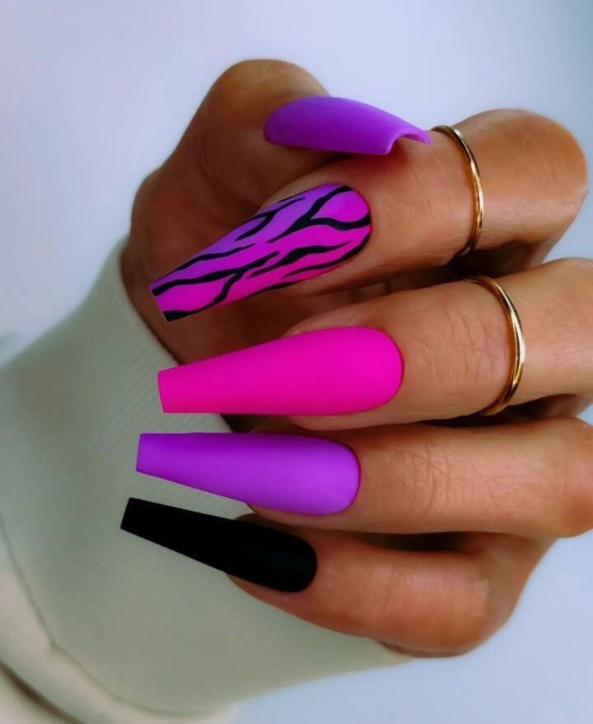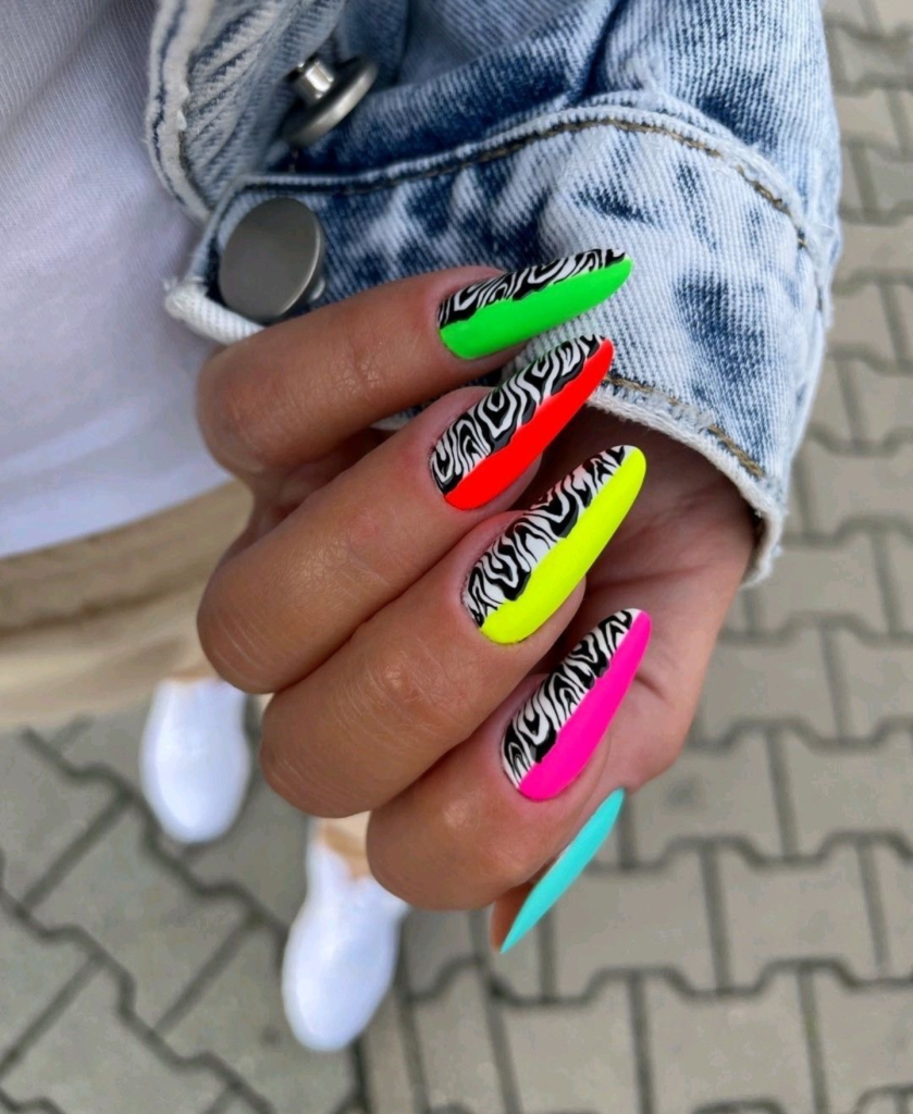 Venture out into the wilderness with these coffin nails that have zebra stripes in black and white on a neon color background. The bright greens, pinks, and blues create a striking contrast that is both fun and smart. The animal print design is a tribute to the constant trend in and with a neon twist is for 2024.