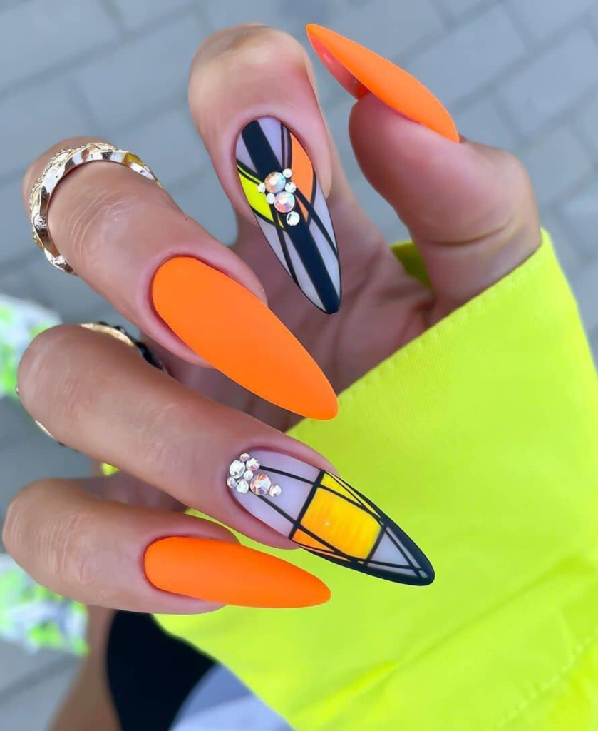 Straight from the palette of raw colors neon orange definitely stands out and exhibits its personality of being full of life without apologies. Thus, together with the use of trendy black lines and the addition of shiny gemstones, this outfit brings a modern twist to the old summer brightness. The coffin design is a perfect rectangle for unconventional ideas and the unused part, which is the cut-out, is a surprise element.
