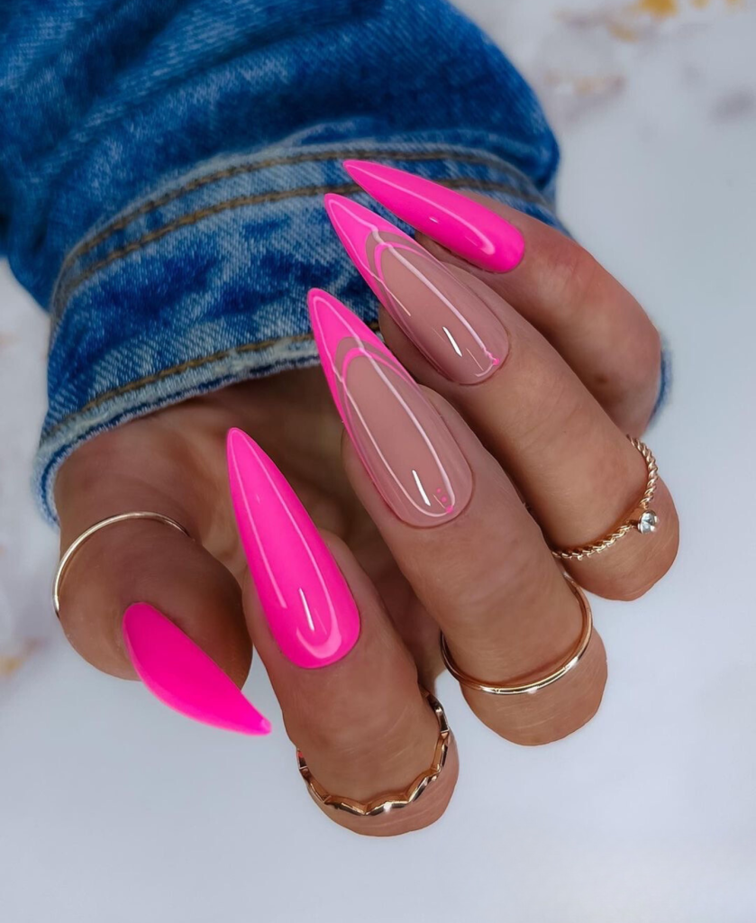 This vibrant, fluorescent pink pair of nails with a touch of nude that is really classy is perfect to go with the Neoni wave. All nails are decorated with a tiny white line that makes them look sophisticated as well as cute and short acrylic design. In addition to this, the 2024 design has come up with this new look; it uses the short nail trend from 2023 as a reference while remaining true to neon and summer, which are both bright and colorful.