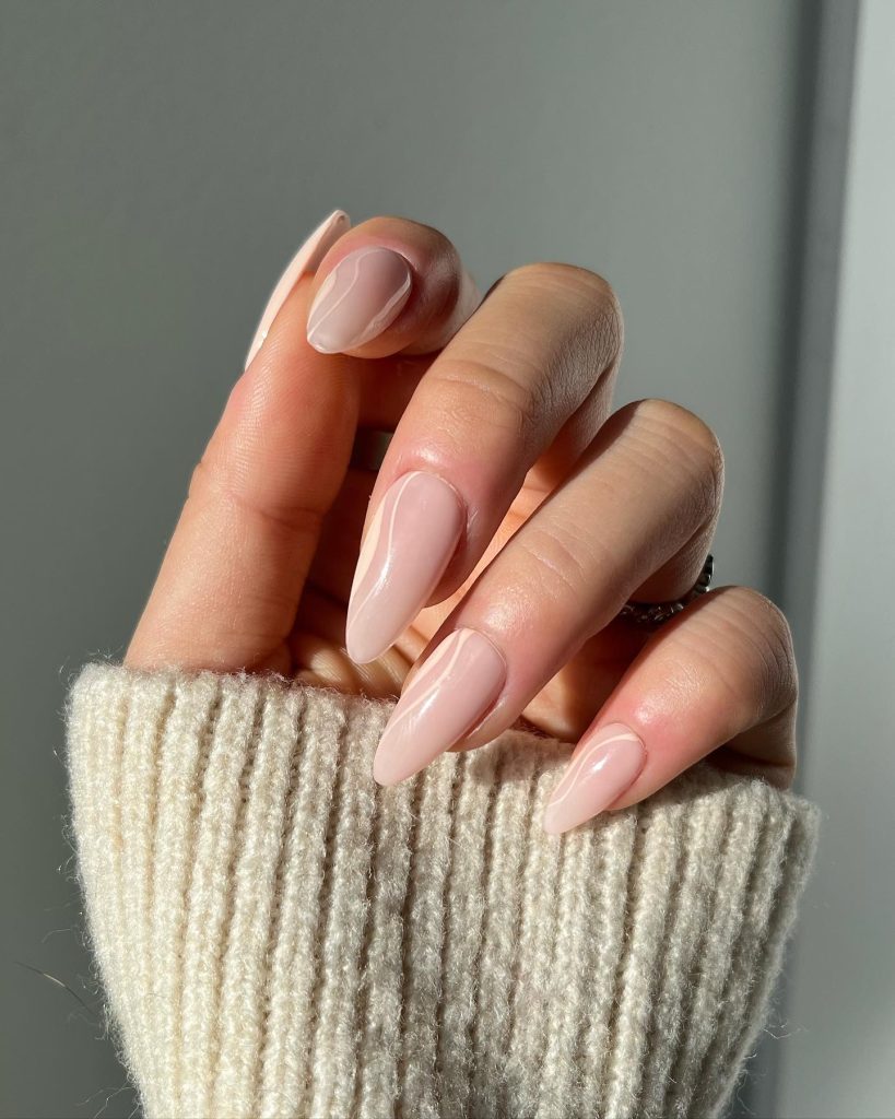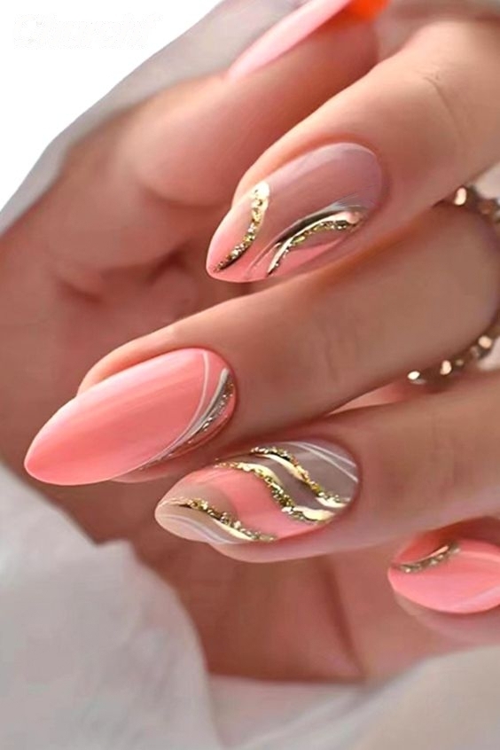 The pastel almond nail design is a modest combination of light pink and beautiful, swirling gold marks that largely contribute to the glam. The peachy pink color is an excellent match for the almond shape which is ideal for spring and Easter celebrations. This look is made unique by the multi-colored gold detail, which gives a bit of elegance but does not outdo the simplicity of the design. For casual and formal settings, the thin metallic lines that baroque the pattern into a wave are just right.
