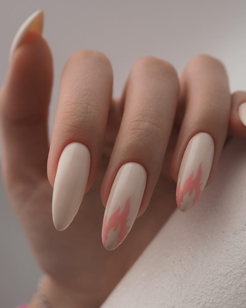 Contrary to the traditional look, these nails are designed with a bold color flaming accent, which is a way of dressing them up with a pop of color. The flaming accent of the almond nail is a design that is both undemonstrative and exciting, very appropriate for the hot character of a person who fancies the idea of being unique. The wearer can easily wear these nails together with a cool jacket or other things as a way of dressing them right.