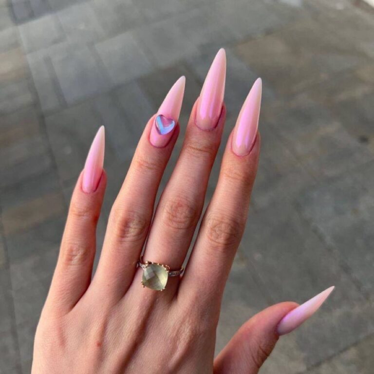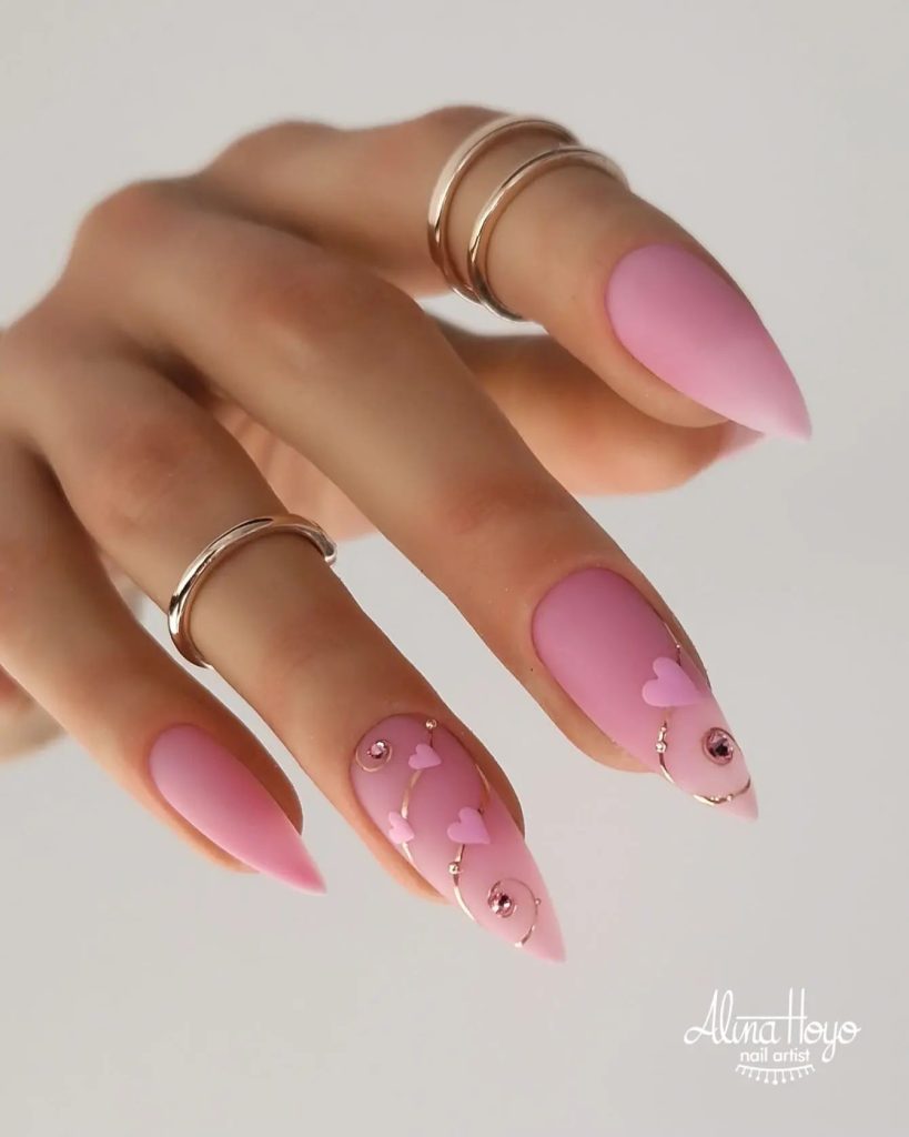 The almond-shaped nails are colored with a pastel pink shade and are embellished with tiny embellishments and small hearts that suit the romantic theme very well. The extra gems and the specific design not only make these nails look good but also add a classy part perfect for women who want to wear jewelry every day or want to wear it for special occasions.