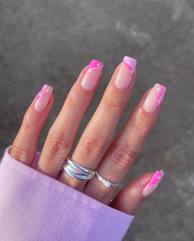 This design is the combination of a soft pink base with bright geometric lines at the tips that are different from the usual styles found on French nails. The striking difference between the pink and the bright geometric designs makes these nails visually attractive and stands for a relatively new way of doing nails that is both chic and playful.