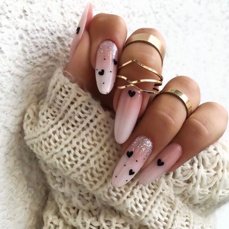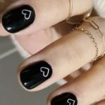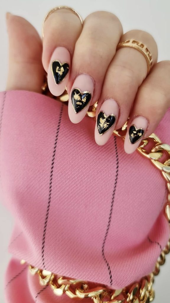 Who states that Valentine’s Day is just for shades of pink and red? This design of nails not only showcases the black base but also has the heart cut out of a gold material that honors the black nails trend. The gold leaf accents halt these nails from just being a professional style; rather, they create the perfect styling for a lady who loves statement and is probably wearing the outfit with the same golden accessories.