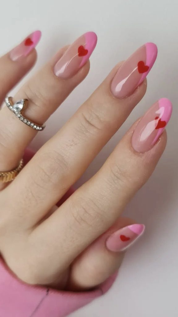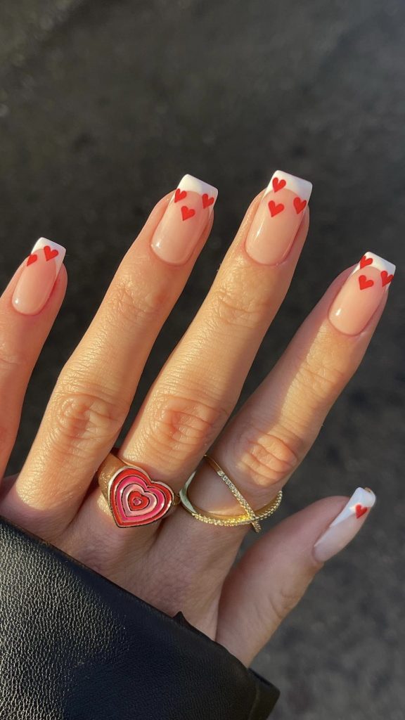 A classic and all-time favorite is the pink color we are beginning with. These are not just any pink; they are the epitome of Valentine’s chic. With short nails in nude, pink, and a hint of whimsical design, these French tips are chic, understated, and perfect for summer. One of the most eye-catching points about these short pink-tipped nails is that a tiny red heart is drawn at the end of each of the pink lines thus bringing the classic French to a new level of love. These nails can be worn with many items and one of the perfect combinations would be with an elegant pair of earrings and a thin bracelet.