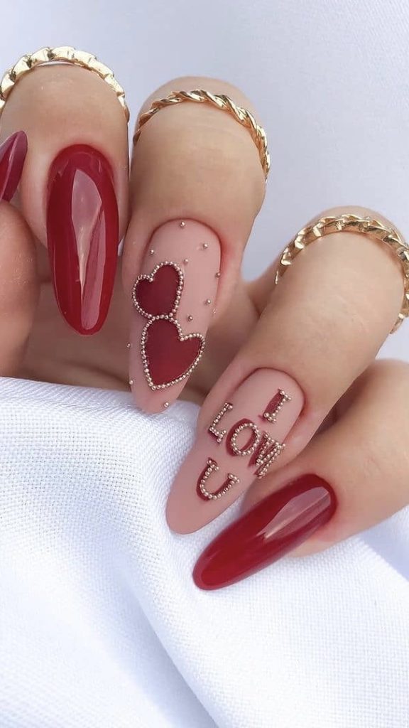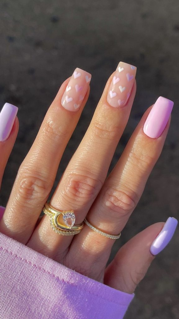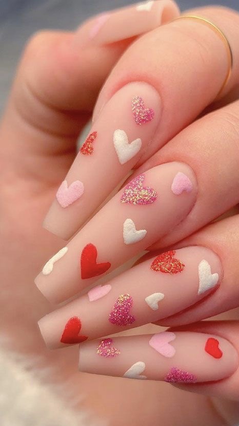 This nail design offers a modern take on Valentine’s aesthetics with geometric hearts in various shades of red and pink. It’s a chic choice for the contemporary woman who enjoys a fresh approach to traditional themes. These nails would pair well with a modern cut dress and minimalist accessories.