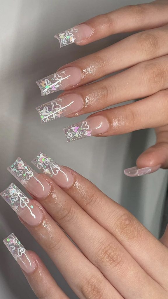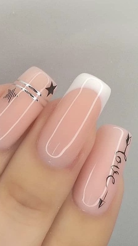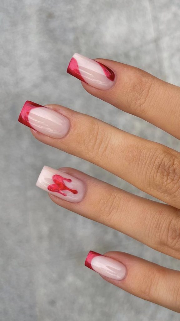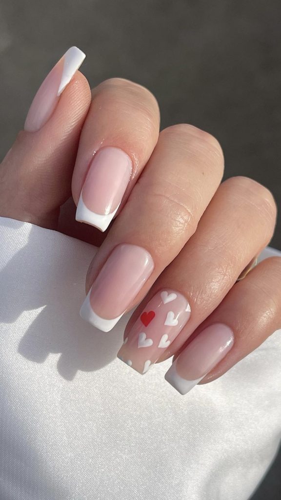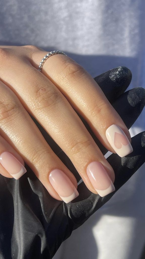 This design is a new take on the traditional French manicure with a romantic twist. The tips are decorated with a fast-moving heart form that is painted using dark red nail polish and catch your eyes easily against the natural base. It is one of the minimalistic but yet brave choices for those who appreciate nails that are simple to design yet powerful in their meaning. The design could be beautifully complemented with a stylish black dress and a bright red clutch for a night out.