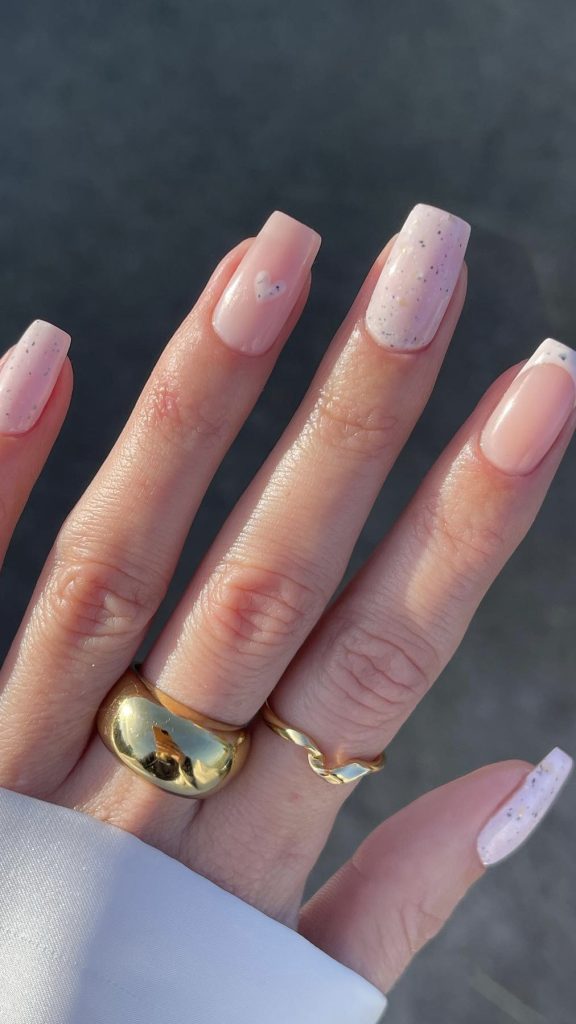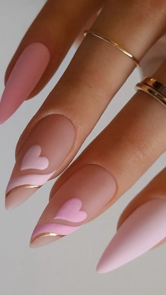 So gentle and charming, these pale pink nails accented with tiny hearts are just the thing for lovers of pastel aesthetics. The gold trim is the perfect touch of luxury that makes it wonderful to combine with a classy present or a Valentine’s Day card. In fact, they are suitable for this.