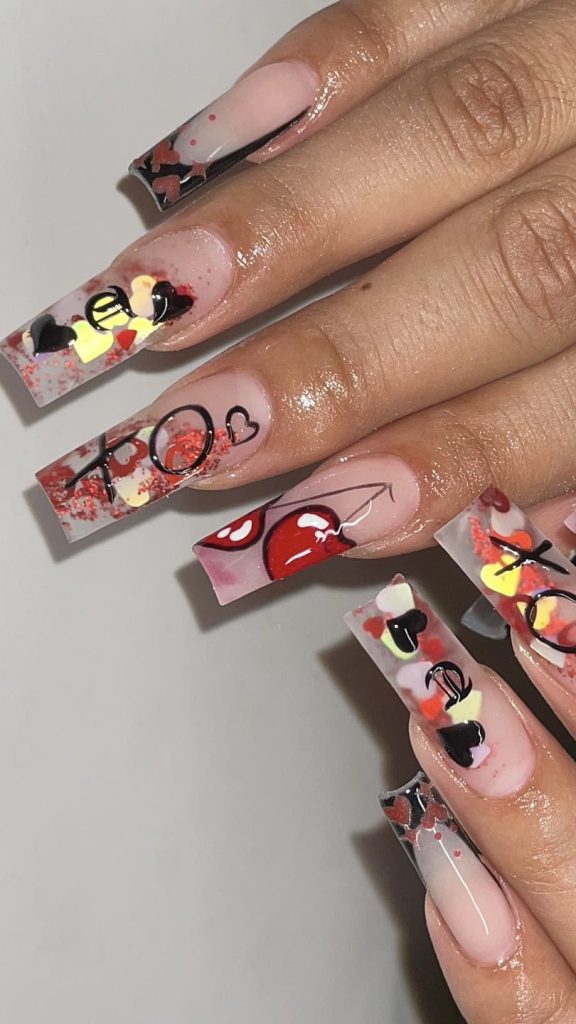 For the pop art lover, these nails resemble a vibrant comic strip with bursts of red and splashes of black. Words of love intermingle with heart balloons and adorable characters, capturing the playful side of Valentine’s Day. These nails are for those who view life as a canvas, ready to be painted with the colors of love.