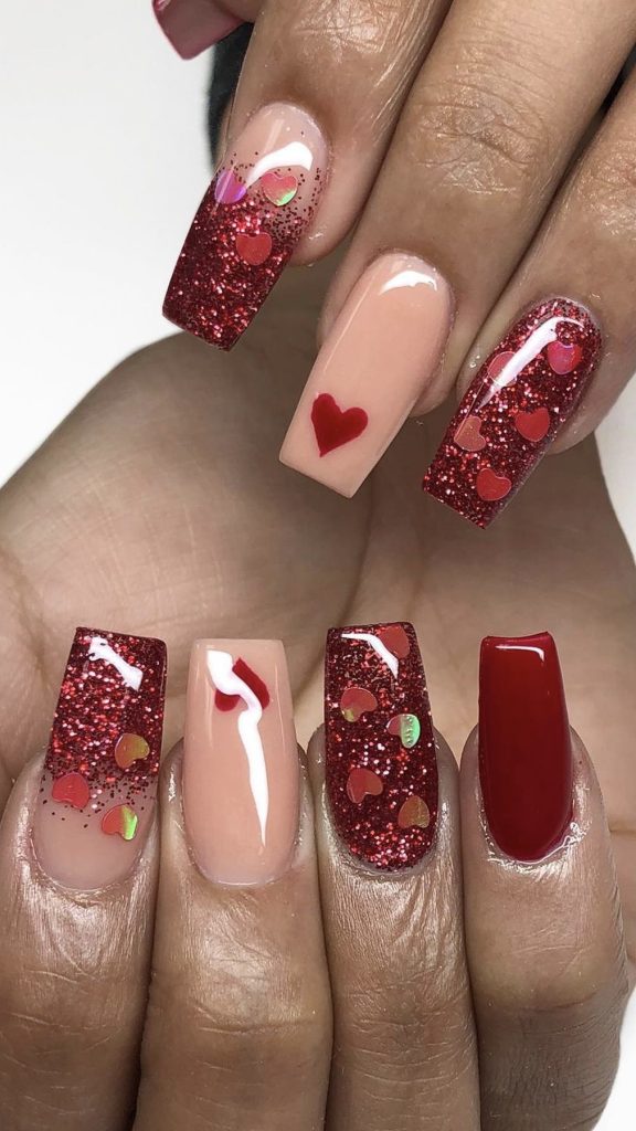 Nothing says celebration like glitter, and these nails embrace it with open arms. The red glittery nails mixed with soft pink hearts create a festive yet short nails look. It’s for the woman who carries the sparkle of love on her fingertips and isn’t afraid to shine.