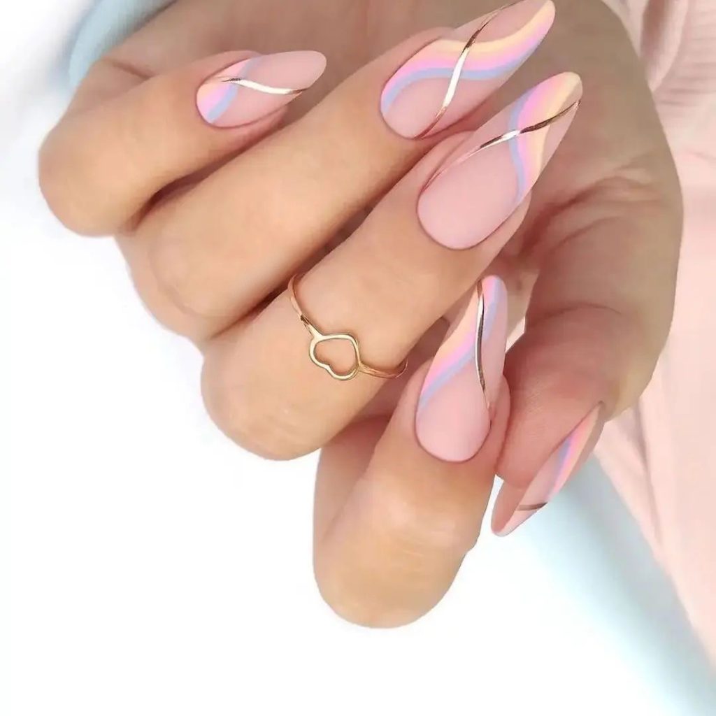The soft play of colors on these almond nails is reminiscent of spring’s tender petals. The design’s subdued tones make it an elegant choice for a sophisticated yet playful look.