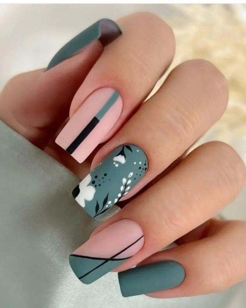 If you are the kind of person who likes to use soft colors, check out these matte fingernails that mix pink and grey in a modern style which is both elegant and short. The addition of a plant element makes the pattern in tune with this season.