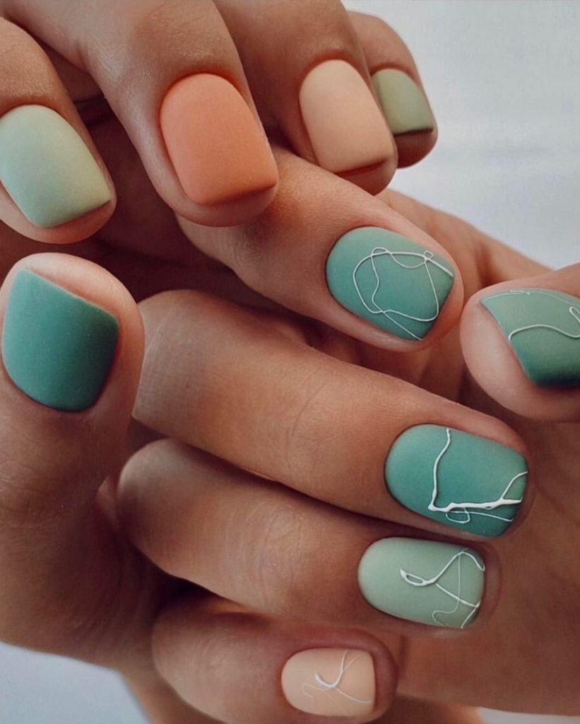 These nails, which of course don’t stand out that much but are still beautiful, have a combination of dull pastels that remind of the soft colors of a spring morning. The unexpected addition is the simple line art, that is almost invisible, which makes this design special for every single nail. The model is ideal for the lady who values the mixture of modesty and a little bit of creativity that means she is relaxed and confident in her short and sweet design for any occasion.