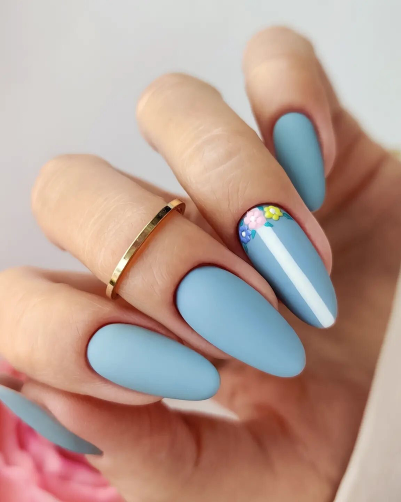 The light-evening blue of a cloudless spring sky embodies the beauty in this matte design. The small and colorful flower decorations at the end of the tip are the ones exploding with color and life just like spring flowers in unexpected places. It is creatively and cute design that is both playful and polished, making it perfect for an almond nail shape that is looking for a feeble but significant mark.