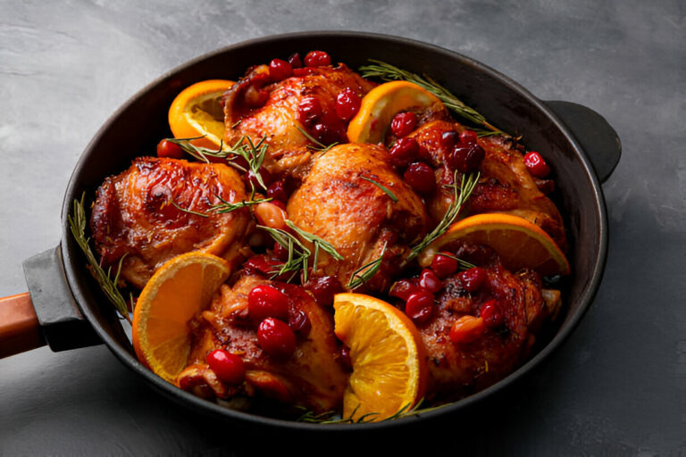 Sweet, savory, and beautifully aromatic, this orange cranberry roasted chicken brings together juicy meat, zesty citrus, and tangy cranberries in a stunning one-pan dish. It’s a cozy yet vibrant centerpiece that’s perfect for gatherings or hearty family dinners.