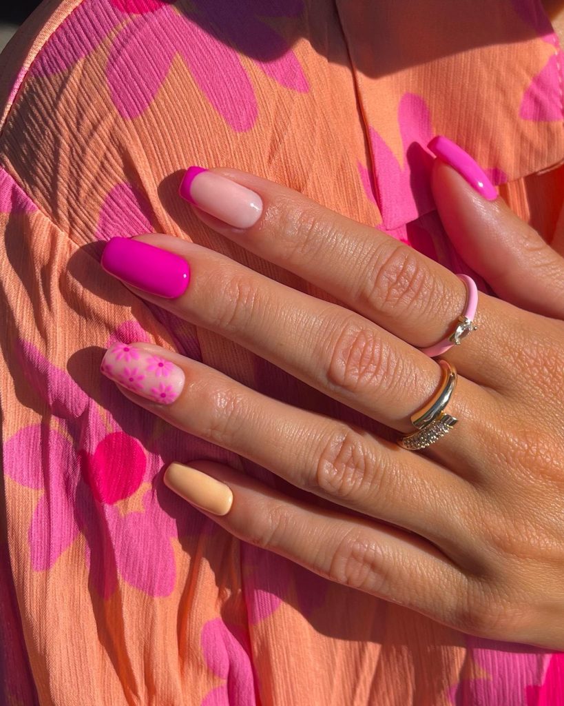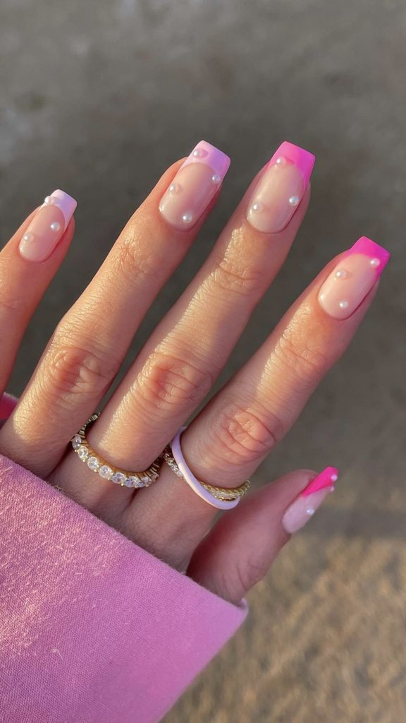 The incorporation of lively hues is the central theme of this design. The nails are predominantly bright pink that resonates with the vividness of summer flowers blossomed fully. The combination of a natural light nail base and contrasting pink tips serves as a purely modern version of the French manicure, thereby indirectly reflecting a sense of drama and a self-assuredness that ignites. These tiny nails which are well-shaped andcute are a good match for a woman who has a high self-image and is not afraid to express her personality, just like the early blooming flowers that risk exposure to the sun.