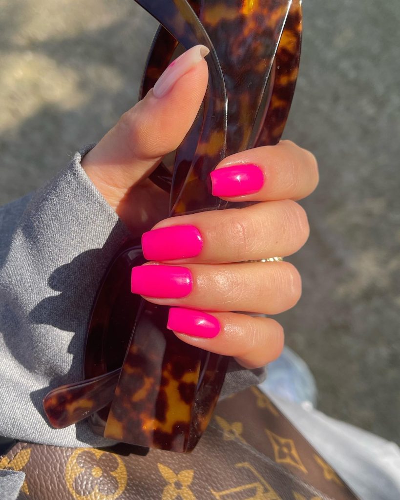 Shades of hot pink nails juxtaposed with the texture of a fuzzy knit sweater embody the spirit of the changeover from winter to spring. The bright pink hue straightly implies the vibrance and liveliness which are typical of the blossoming flowers and the longlasting days. This square shape of nails really demonstrates the classic and elegant look making it the top choice of people who like to add a different color to their simple outfits.
