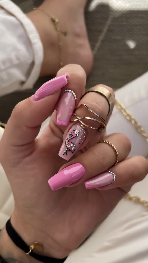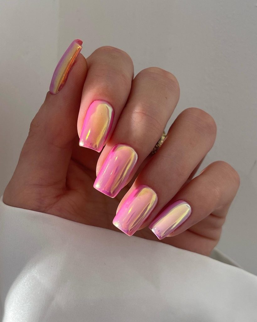 This chrome nail design offers a brilliant spectrum of pink hues to those who wish to marry the future with the charm of spring. While the coffin shape gives a modern note, the iridescent finish perfectly represents the changing nature of spring skies at sunset. It is a new design, just like a skin is to a human who is progressive and forward-thinking.
