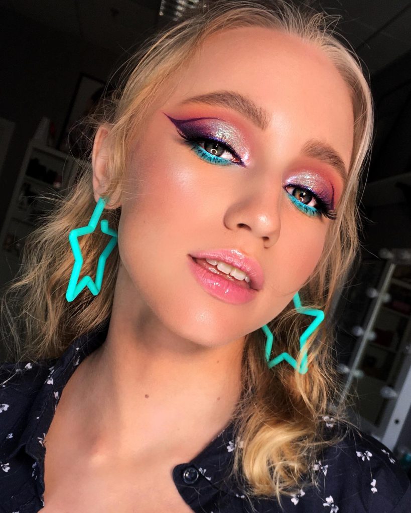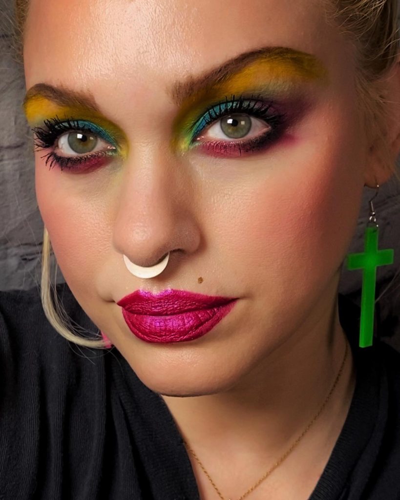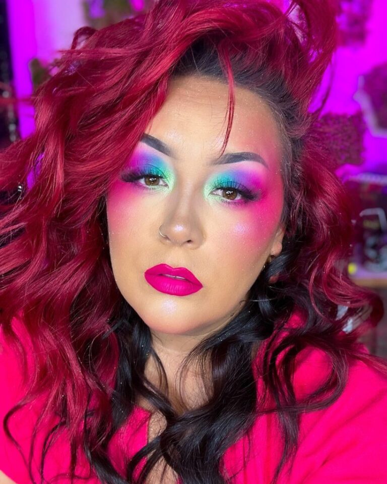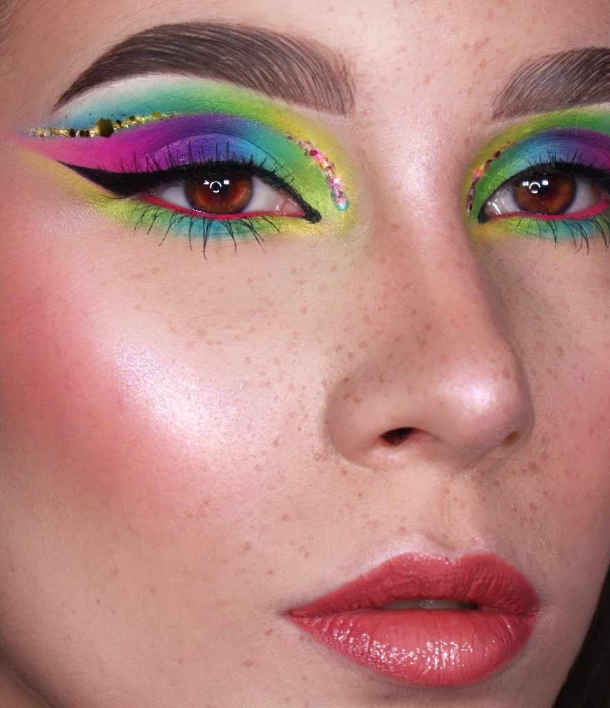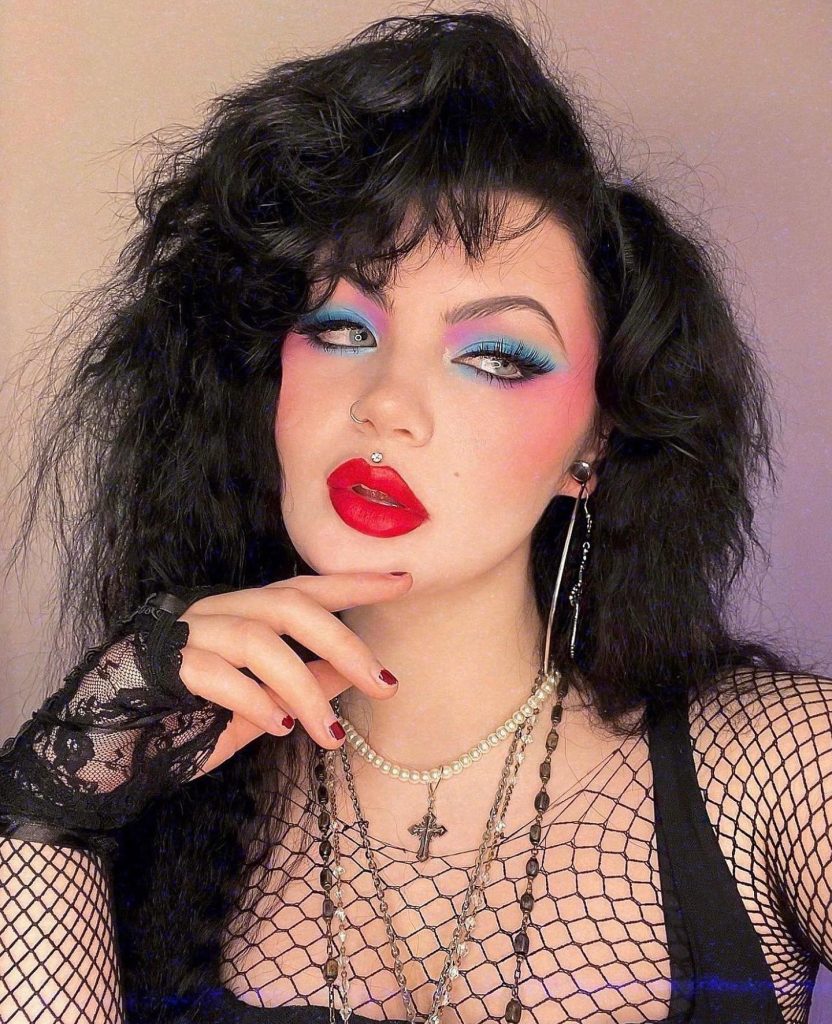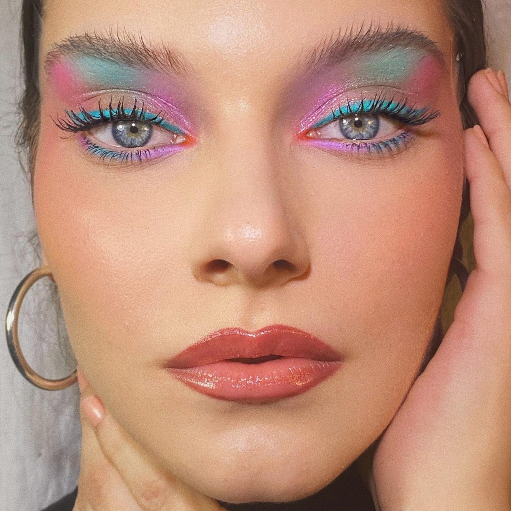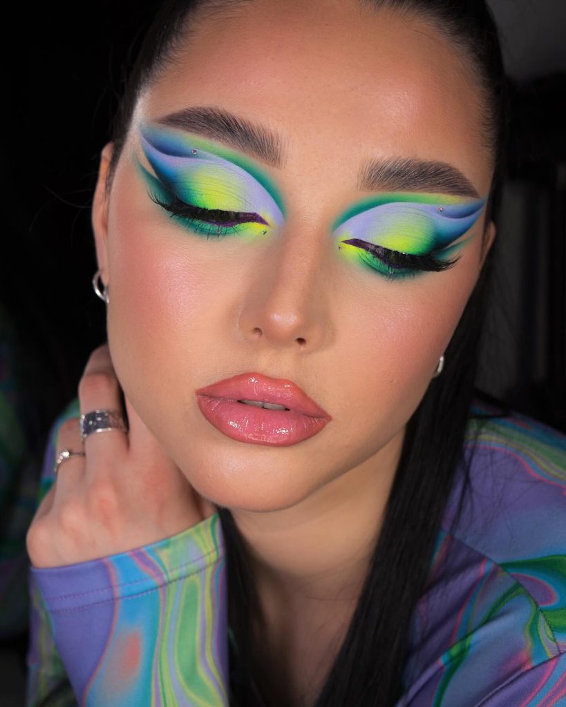 This image is all about creativity. The makeup artist has overcome the time barrier and come up with a style based on the 80s rock playbook with a neon symphony of greens and blues. The smokey eye is reimagined with a luminous twist, thus, it’s a statement piece. The bravado of the electric colors that are the smokey eyes recalls the disco period’s bold use of colors. In order to duplicate this look, one can certainly find an eyeshadows tutorial that presents the technique of blending such bright colors together.