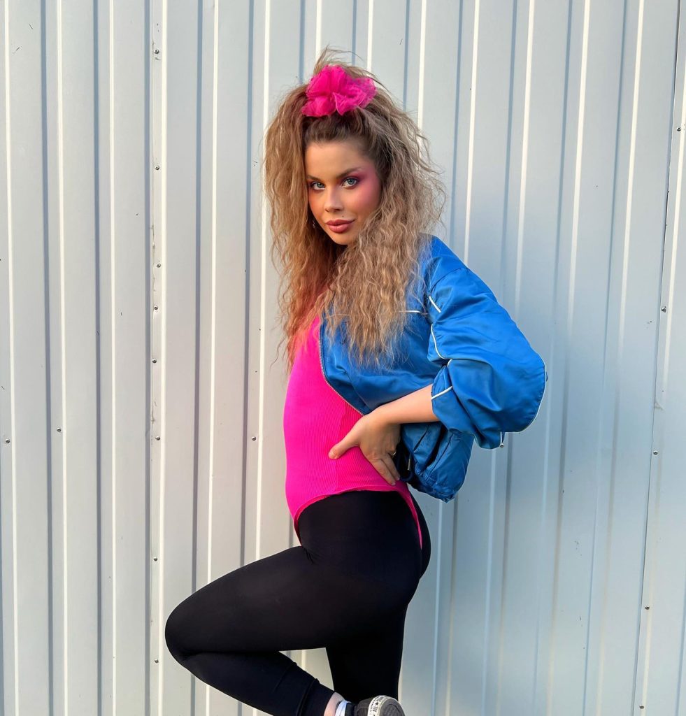 This image evokes the essence of the 80s workout culture blended with the day’s most fashionable attire. The hair is as voluminous as the era’s fitness craze, and the makeup is a blend of fitness and rock—dynamic and bold. The pink attire pops with energy against the blue jacket, echoing the disco and rock vibes of the time.