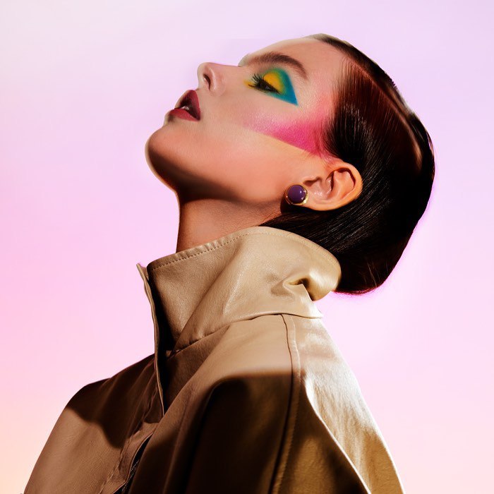 This picture is reminiscent of a modernist painting that has been manifested through its geometrical accuracy and its blocks of color that are commanding. The eye shadows in turn give the impression of depth by being true to form with an 80s vibe but modern in the approach. The style is a fabulous exhibition of disco chic presenting the colorful authenticity of 80s rock stars.