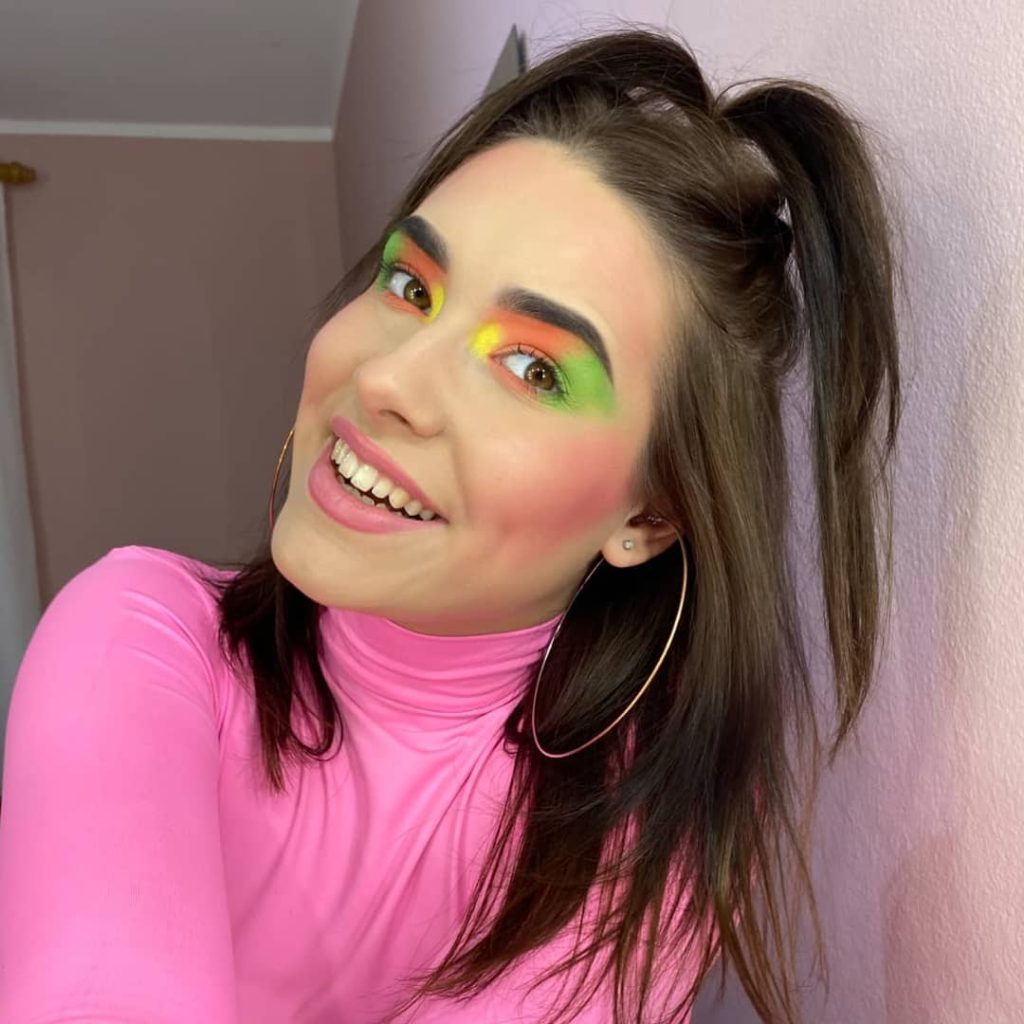 The image depicts the very essence of the 80s style of new wave, an epoch characterized by neon dominating everything. This makeup style is the exact embodiment of the era, with hot pink eyeshadows and electric blue splash. The contrary colors are adventurous, playful, and shout out the vibes of both rock and disco equally.
