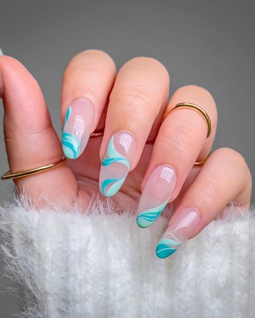 A soft mint and pink color fluid shapes move to music on a clear base in this design that is humorous and yet sophisticated. These are long nails that are a way of expression for an artist who is free in the process of creating. They are the best choice for a girl who enjoys intricate designs and believes that art is a visual expression of life and its eternal flow.